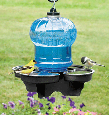А вот подвесная металлическая ванночка, отделения которой автоматически пополняются свежей водой из голубой канистры. Достаточно наполнить ее один раз, и птицы будут обеспечены развлечениями в ванночке и питьевой водой примерно на неделю.