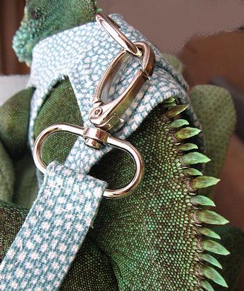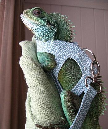 Надеть на ящерку ошейник невозможно, а вот специальная шлейка подойдет. Она крепится на лапах как жилет с застежкой-карабином сзади. От собачьей отличается более мягким материалом и широкими ремнями.